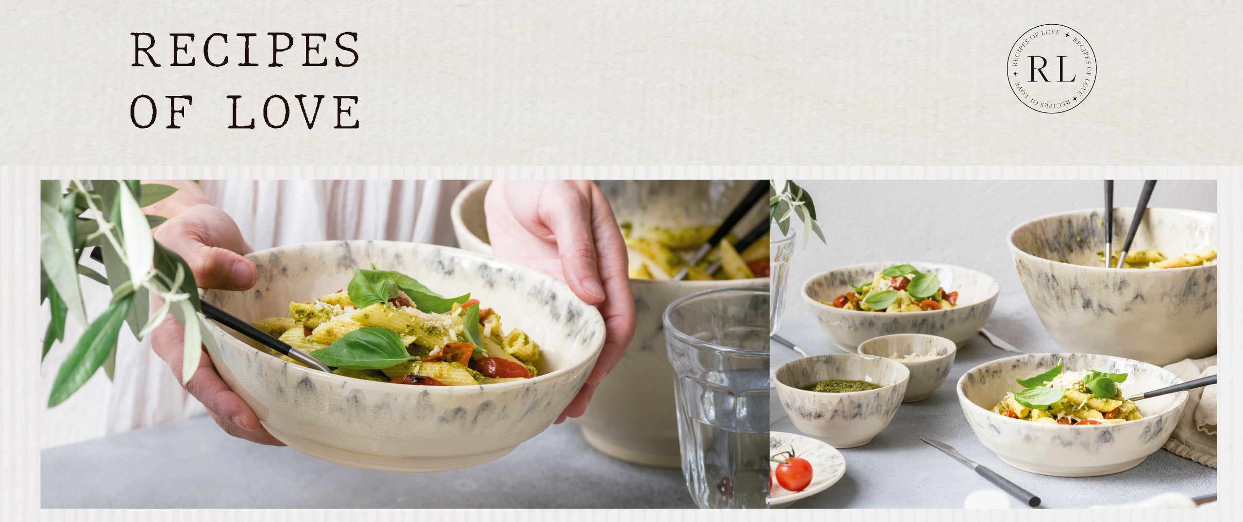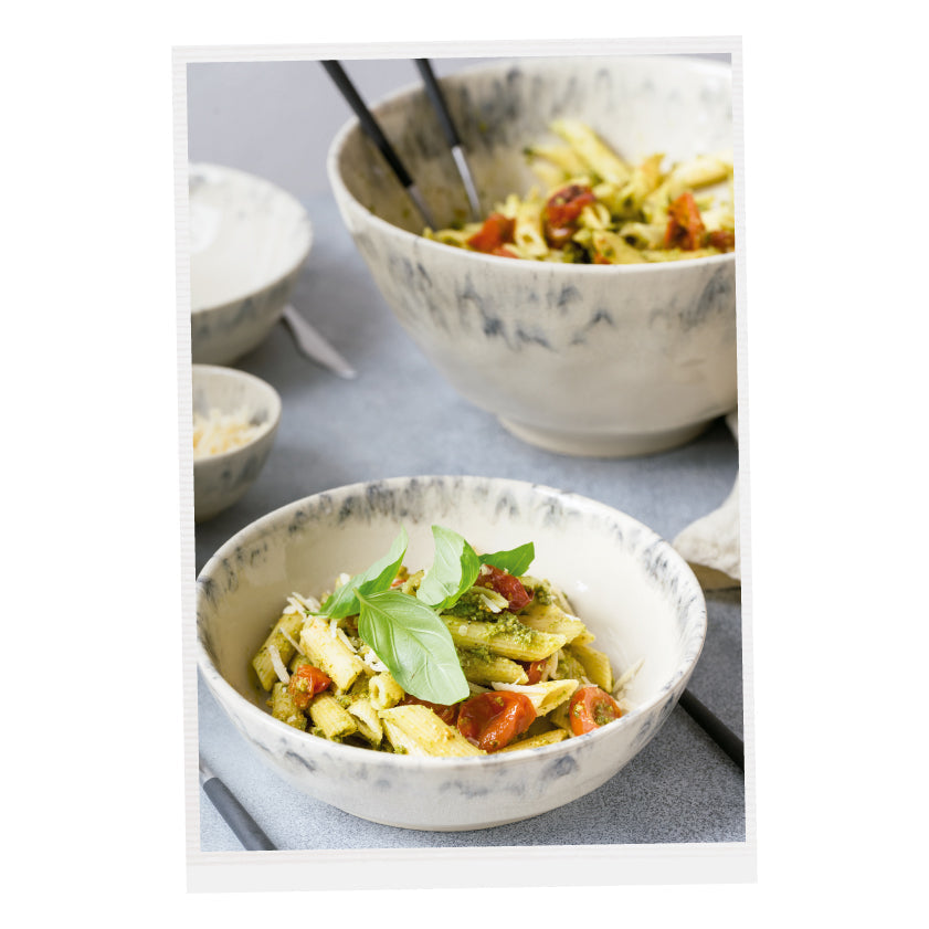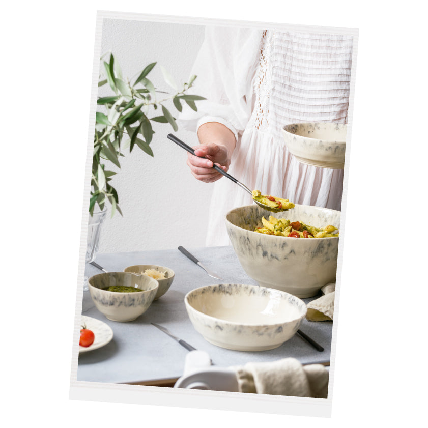 July love letter. To longer days, to golden sunsets, to sharing food at the table. Summer brings us closer, and makes us gather more often in beautiful tables, with most delicious food. Salads are always welcome and the combination of pasta, pesto, basil and tomato is just wonderful and so easy to prepare. Set your table with the loveliest tableware and enjoy your summer meal.